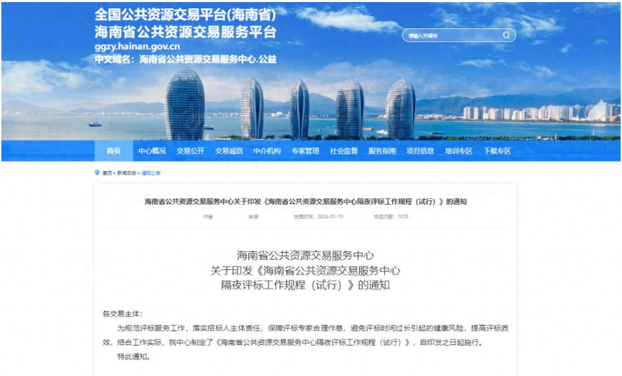 海南省公共資源交易服務(wù)中心隔夜評(píng)標(biāo)工作規(guī)程(試行) 第一章 總則 第一條 為規(guī)范隔夜評(píng)標(biāo)服務(wù),保障評(píng)標(biāo)專家合理作息,避免評(píng)標(biāo)時(shí)間過長(zhǎng)引起的健康風(fēng)險(xiǎn),提高評(píng)標(biāo)質(zhì)效,根據(jù)《中華人民...