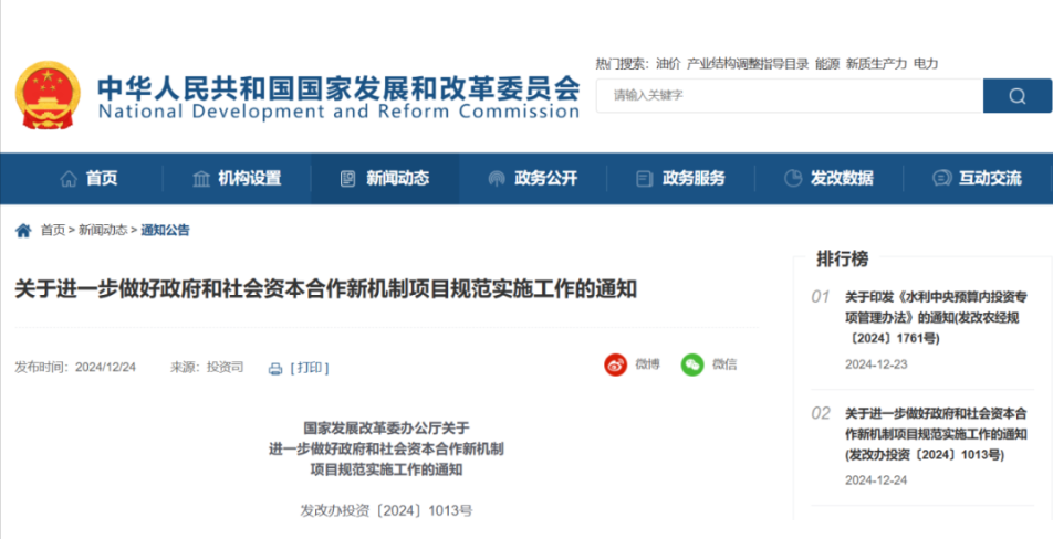 國家發(fā)展改革委辦公廳關(guān)于進(jìn)一步做好政府和社會(huì)資本合作新機(jī)制項(xiàng)目規(guī)范實(shí)施工作的通知發(fā)改辦投資〔2024〕1013號各省、自治區(qū)、直轄市及計(jì)劃單列市、新疆生產(chǎn)建設(shè)兵團(tuán)發(fā)展改...