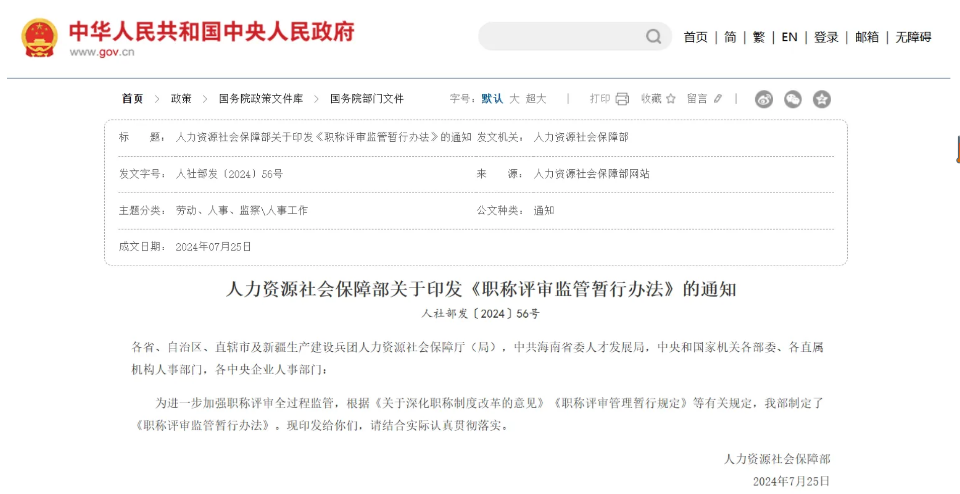 近日,人社部印發(fā)《職稱評審監(jiān)管暫行辦法》(人社部發(fā)〔2024〕56號)?! ?、《辦法》有什么重要意義? 近年來,在“破四唯”、“立新標”、放權松綁...