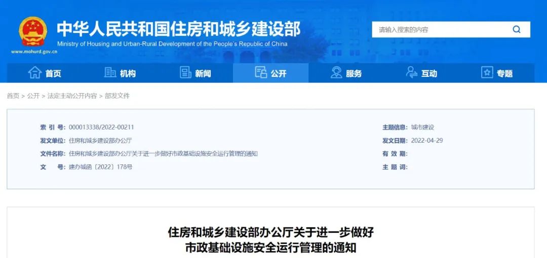 住房和城鄉(xiāng)建設(shè)部辦公廳通知要求進(jìn)一步做好市政基礎(chǔ)設(shè)施安全運(yùn)行管理工作為認(rèn)真貫徹落實(shí)習(xí)近平總書(shū)記關(guān)于安全生產(chǎn)的重要指示精神和黨中央、國(guó)務(wù)院決策部署,落實(shí)國(guó)務(wù)院安全生...