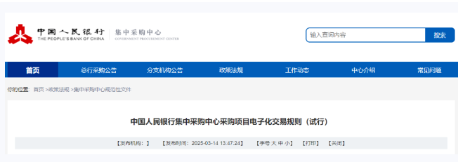 中國人民銀行集中采購中心采購項(xiàng)目電子化交易規(guī)則(試行) 第一章 總 則 第一條 為推進(jìn)中國人民銀行集中采購中心(以下簡稱集中采購中心)采購項(xiàng)目全流程電子化交易,規(guī)范電子化交易...