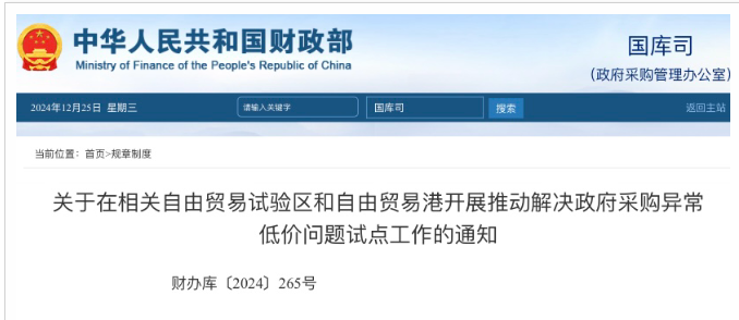 關(guān)于在相關(guān)自由貿(mào)易試驗(yàn)區(qū)和自由貿(mào)易港開展推動(dòng)解決政府采購異常低價(jià)問題試點(diǎn)工作的通知財(cái)辦庫〔2024〕265號 北京市財(cái)政局、天津市財(cái)政局、上海市財(cái)政局、福建省財(cái)政廳、...