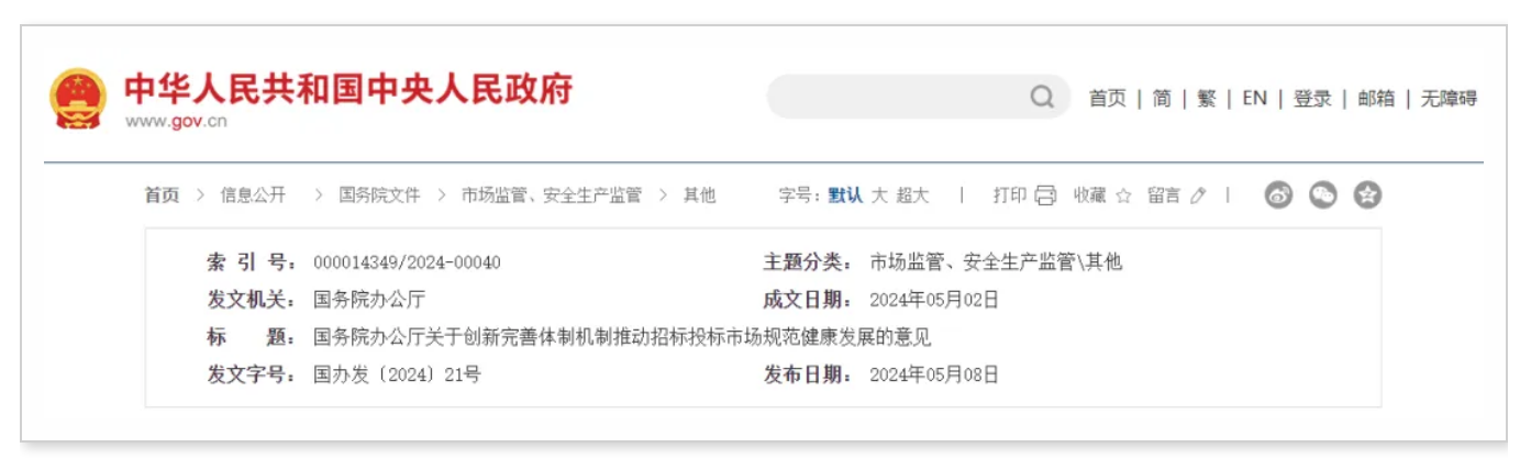國(guó)務(wù)院辦公廳關(guān)于創(chuàng)新完善體制機(jī)制推動(dòng)招標(biāo)投標(biāo)市場(chǎng)規(guī)范健康發(fā)展的意見(jiàn) 國(guó)辦發(fā)〔2024〕21號(hào) 各省、自治區(qū)、直轄市人民政府,國(guó)務(wù)院各部委、各直屬機(jī)構(gòu): 招標(biāo)投標(biāo)...