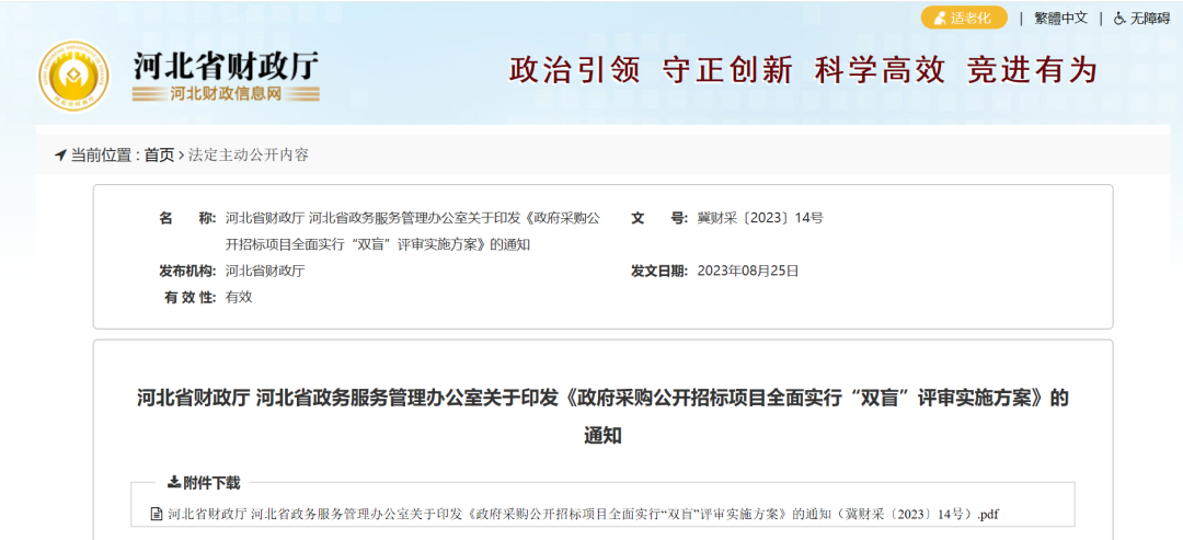 河北省政務(wù)服務(wù)管理辦公室發(fā)布關(guān)于印發(fā)《政府采購公開招標(biāo)項(xiàng)目全面實(shí)行“雙盲”評審實(shí)施方案》的通知!