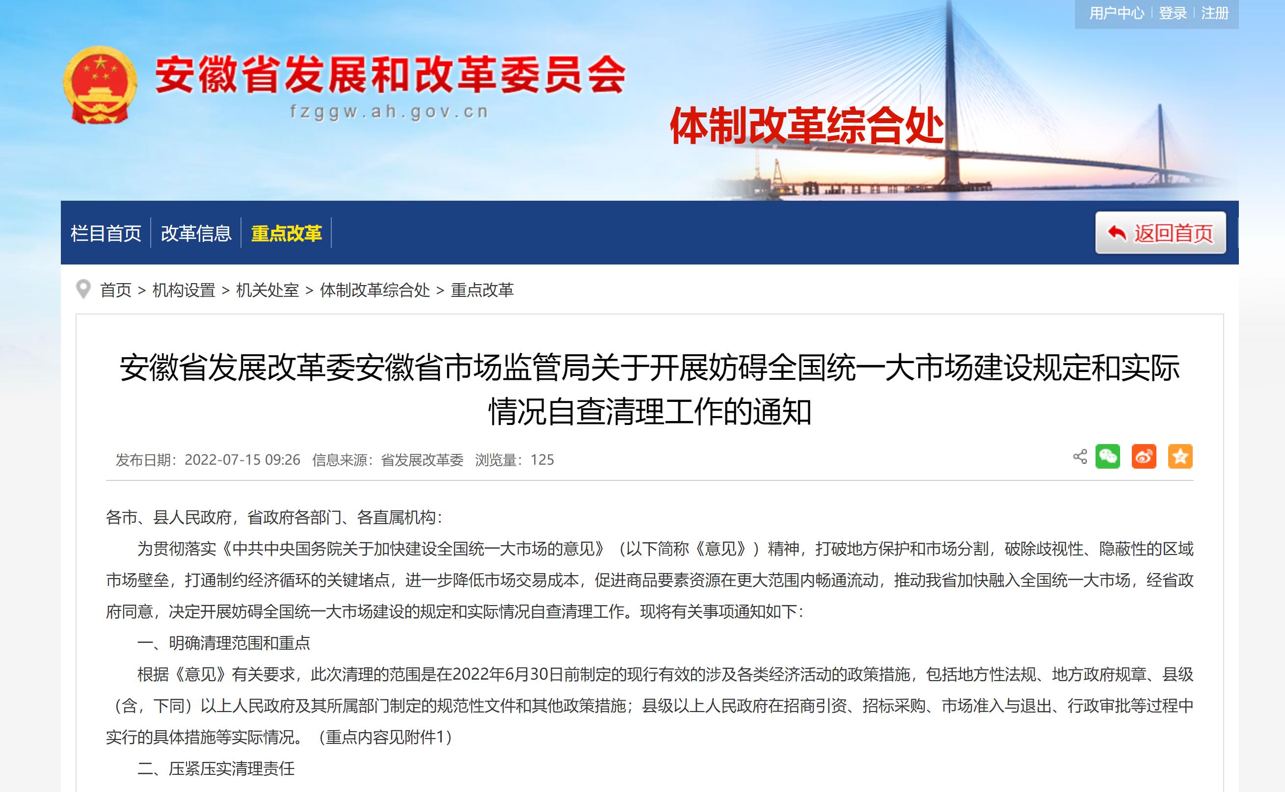 近日,安徽省發(fā)展和改革委、省市場(chǎng)監(jiān)管局聯(lián)合發(fā)布《關(guān)于開展妨礙全國(guó)統(tǒng)一大市場(chǎng)建設(shè)規(guī)定和實(shí)際情況自查清理工作的通知》(以下簡(jiǎn)稱《通知》),其中明確清理的具體范圍和重點(diǎn)。...