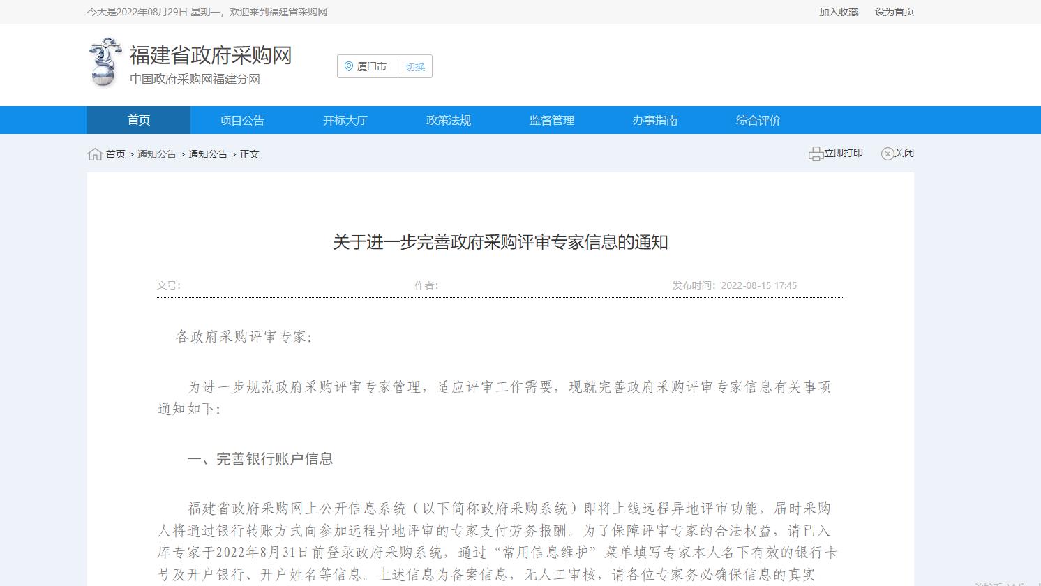 近日,福建省財(cái)政廳政府采購監(jiān)督管理辦公室印發(fā)《關(guān)于進(jìn)一步完善政府采購評審專家信息的通知》(以下簡稱《通知》),以進(jìn)一步規(guī)范政府采購評審專家管理,適應(yīng)評審工作需要。...
