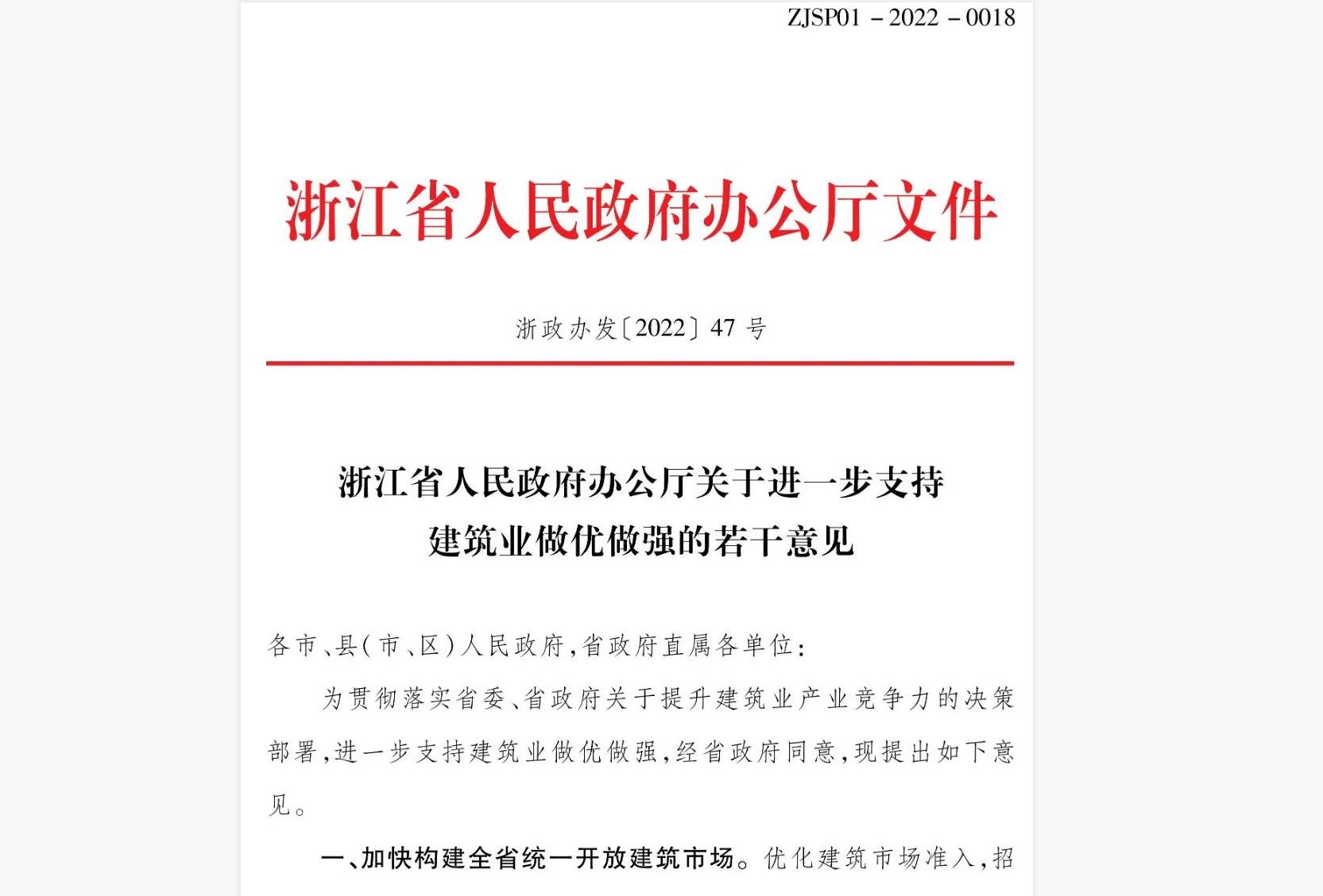 7月20日,浙江省人民政府辦公廳發(fā)布《關于進一步支持建筑業(yè)做優(yōu)做強的若干意見》,《意見》提出:要減輕建筑業(yè)企業(yè)負擔。全面推行保證保險、銀行保函替代現(xiàn)金繳納投標、履約、工程質量、農(nóng)民工工資等保證金,加快推行電子保...