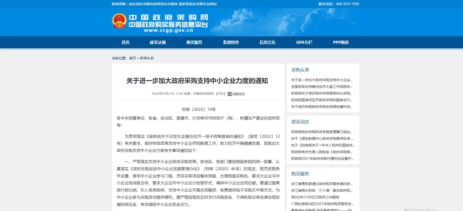 為貫徹落實(shí)《國務(wù)院關(guān)于印發(fā)扎實(shí)穩(wěn)住經(jīng)濟(jì)一攬子政策措施的通知》(國發(fā)〔2022〕12號(hào))有關(guān)要求,做好財(cái)政政策支持中小企業(yè)紓困解難工作,助力經(jīng)濟(jì)平穩(wěn)健康發(fā)展,現(xiàn)就加大政府采購支持中小企業(yè)力度有關(guān)事項(xiàng)通知...