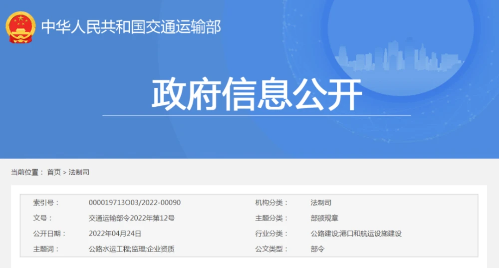 4月24日,交通運(yùn)輸部官網(wǎng)發(fā)布《 公路水運(yùn)工程監(jiān)理企業(yè)資質(zhì)管理規(guī)定(中華人民共和國交通運(yùn)輸部令2022年第12號)》, 自2022年6月1日起施行!